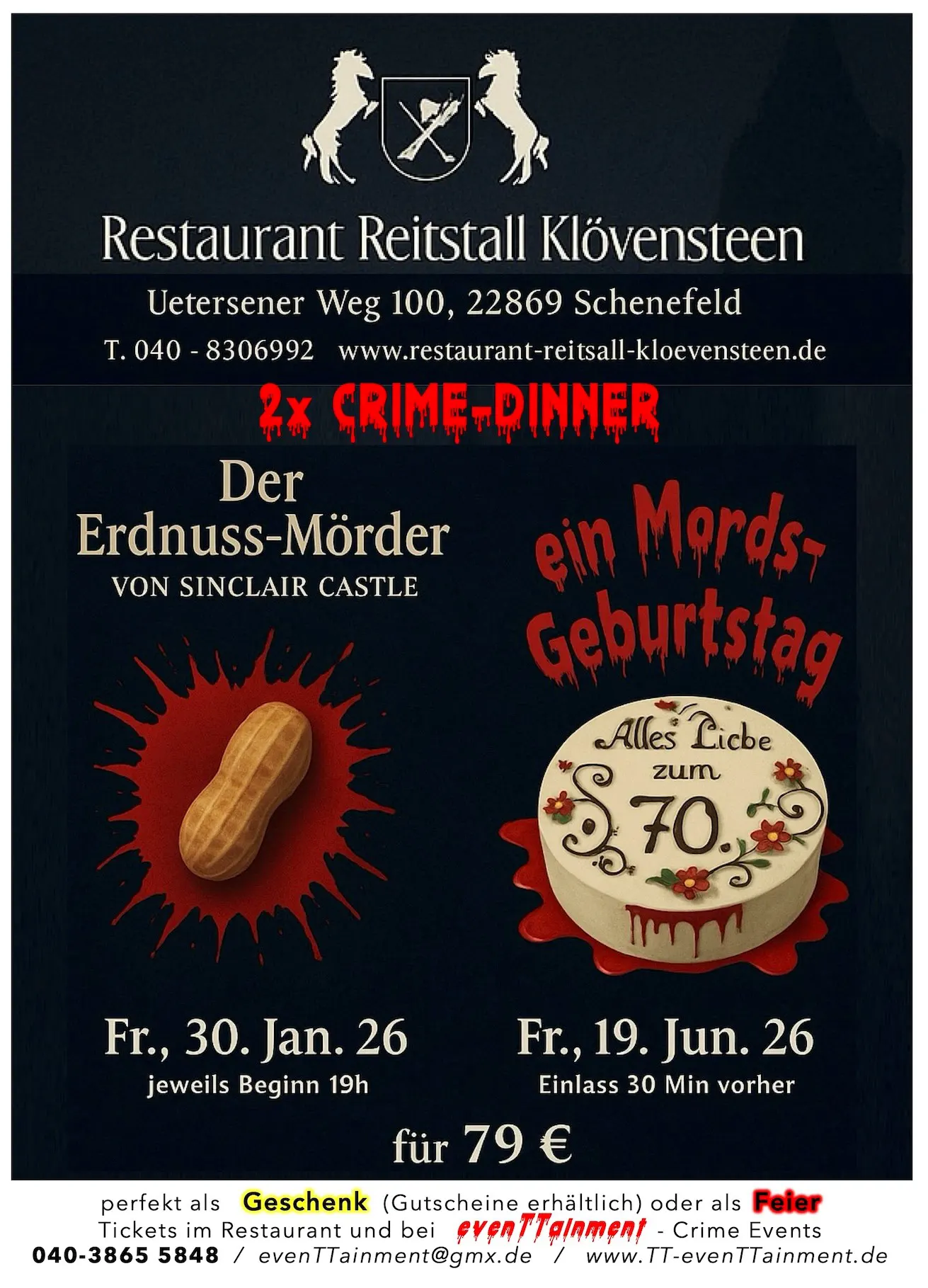 🎟️ Tickets gibt es direkt im Restaurant Reitstall Klövensteen oder bei evenTTainment Crime Events.